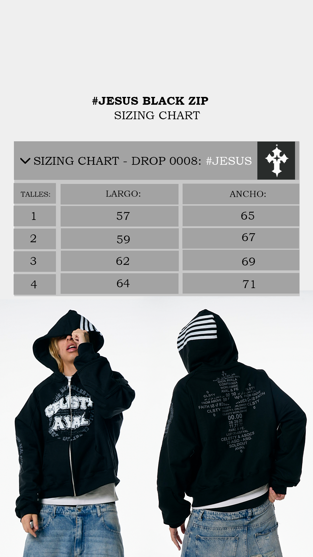 En esta página podrás ver la guía de talles de nuestro drop #AVAL, #AVALSUMMER, #SYSTEM, #AETHER, #2026 & #JESUS Las camperas y remeras son más al cuerpo. En cambio, los pantalones son bastante grandes, al igual que los shorts.